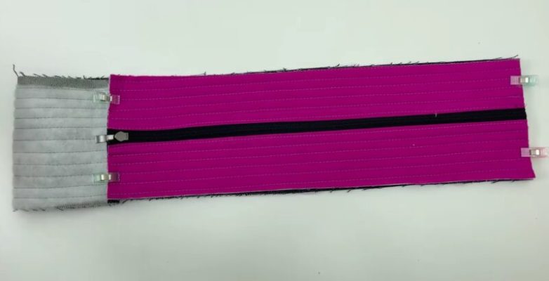 По обеим сторонам от молнии проложите декоративные фиксирующие строчки. Края подрежьте таким образом, чтобы суммарная ширина заготовки вместе с молнией равнялась 13 см.