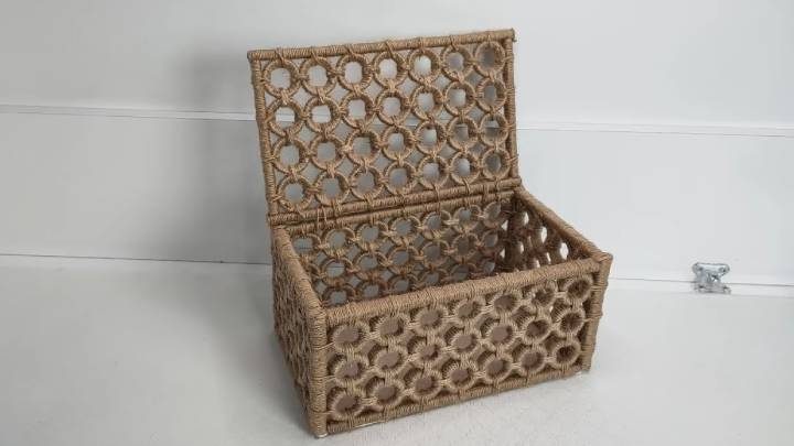 Склейте детали между собой, на дно — картон; соберите короб. Зафиксируйте крышку джутом, чтобы она открывалась и закрывалась без проблем.