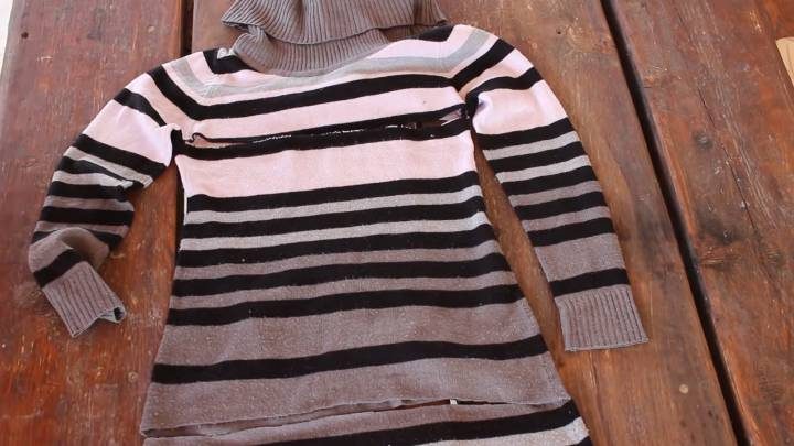 От свитера или любой другой одежды отрежьте верхнюю часть с рукавами — она понадобится позже. Используйте туловище.