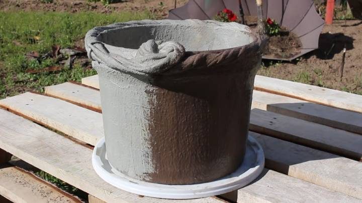 Разведите цемент водой до жидкого состояния. Замочите в нём ткань. Возьмите любое пластиковое ведёрко. Наденьте на него ткань.