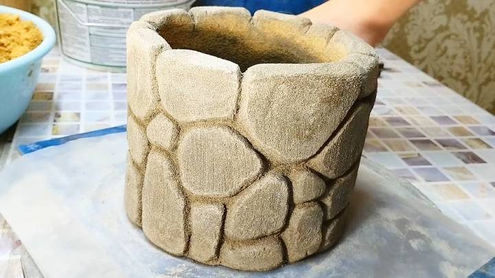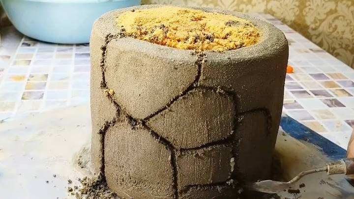 Взгляните на эту рукотворную красоту! Её сможет сделать абсолютно каждый человек. Это нетрудно, но очень интересно! Небольшой горшок для цветов из цемента с имитацией натурального камня — то, что нужно каждому садоводу! Можно увеличить объём и сделать полноценный вазон для участка.