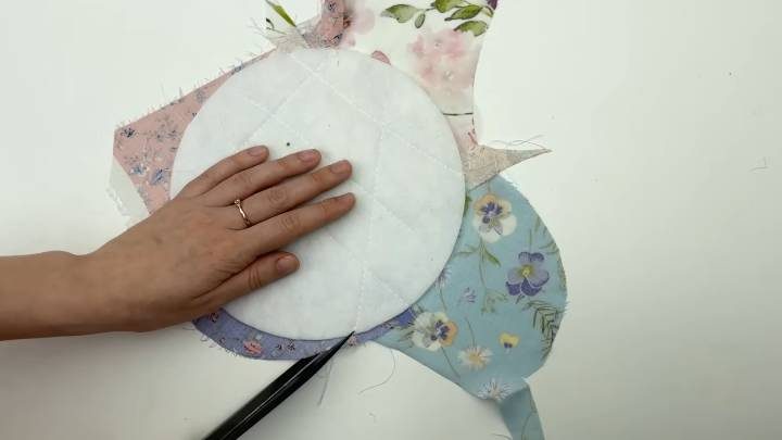 Из ватина или синтепона вырежьте круг диаметром 19,5 см. Разложите на нём лоскутки ткани, как показано выше, закрепите на машинке. Обрежьте лишнее. Простегайте.
