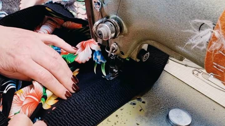 Подберите ажурную резинку на вашу талию. Цвет должен сочетаться с тканью. Сшейте резинку внахлёст, наложив один край на другой. На равном расстоянии вставьте булавки в резинку (8 частей). Такую же разметку сделайте и на юбке. Совместите с резинкой. Сшейте на машинке.