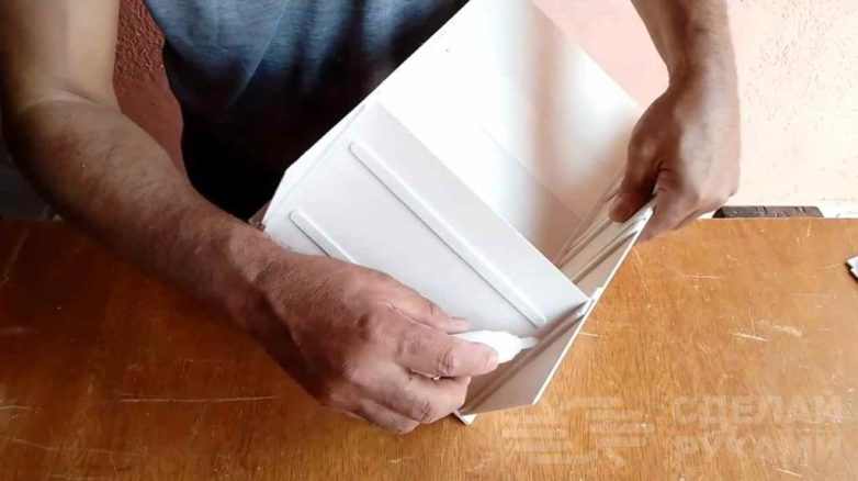 С тыльной стороны автор приклеивает к стенке ребра жесткости из полос пластика. Для этого лучше использовать цианакрилатный клей.