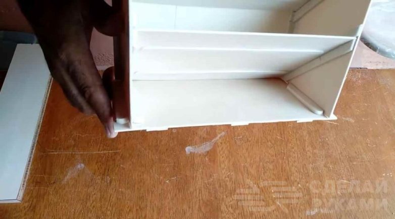 После этого вставляем отрезанные по размеру куски пластика в направляющие, фиксируем их клеем. Чтобы усилить жесткость полок, приклеиваем к ним ребра жесткости.