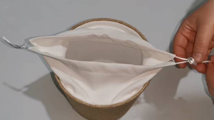 Замерьте диаметр ведерка. Перенесите полученную цифру на х/б ткань. Сшейте неширокую кольцевую деталь, у которой есть кармашек по краю — отверстие, куда можно вставить шнур.