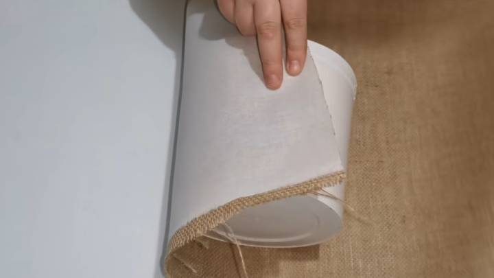 У ведерка 3—5 кг обрежьте ободок, уберите крышку. К мешковине с помощью утюга прикрепите ткань на клеевой основе. Оберните ведёрко, приклейте, обрежьте лишнее.