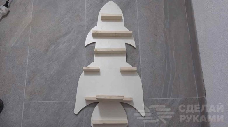 В данном обзоре мастер показывает, как своими руками сделать оригинальную и стильную полку-ракету в детскую комнату. В качестве основного материала можно использовать фанеру или МДФ.
