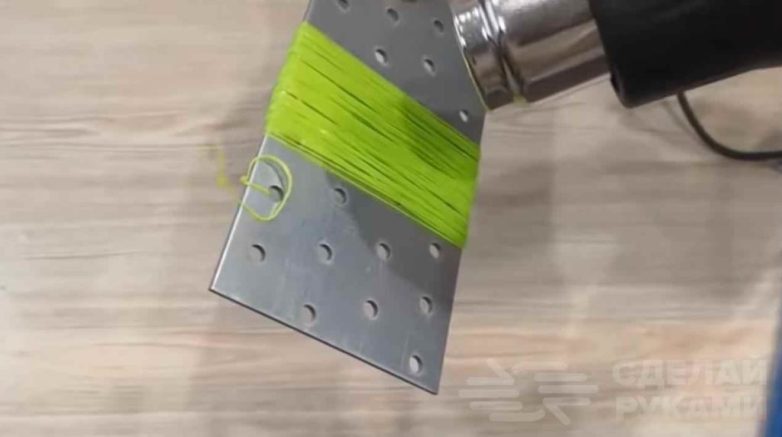 Вставляем в прорезанное отверстие в ручке каждый пучок и фиксируем его пластиковой лентой. Обернув всю ручку, опять нагреваем и получаем окончательную форму.