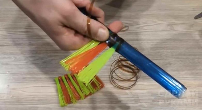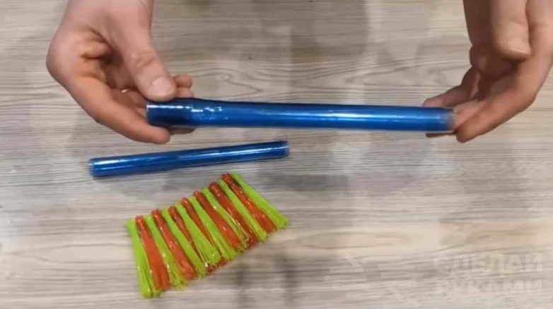 На следующем этапе можно приступить к изготовлению самой щетки. Для этого срезаем верх и низ бутылок, и разрезаем бутылку вдоль. Наматываем её на круглую палочку и фиксируем лентой.