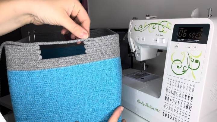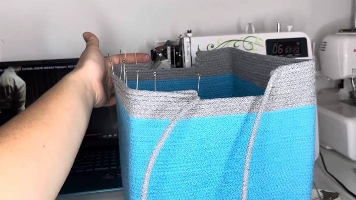 Добавьте шнур 5 мм другого цвета, сшейте 4—5 рядов. Затем определите, на каких сторонах будут располагаться ручки. На них найдите середину, воткните портновскую булавку. Отмерьте влево и вправо одинаковое расстояние (по 5 см), снова поставьте булавки. Сложите шнур пополам и начните шить до отмеченных булавкой мест (5—6 рядов). Затем шнур обрежьте. Перейдите на противоположную сторону. По аналогичному принципу заполните её.