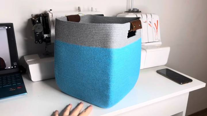 Сделайте ещё 4—5 рядов. В конце шнур обрежьте. По желанию ручки можно декорировать. Получилась удивительная прямоугольная корзинка!