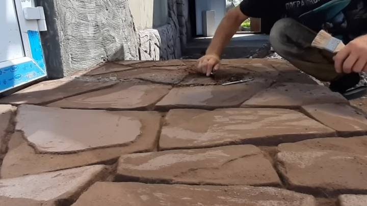 Сделайте основу. Смешайте цемент с песком 1:2, добавьте жменю фиброволокна и пластификатор по инструкции. Замесите в меру густой раствор. Нанесите на поверхность, выровняйте. Через час возьмите жёсткую металлическую щётку. Сделайте борозды, чтобы следующий слой лучше схватился.