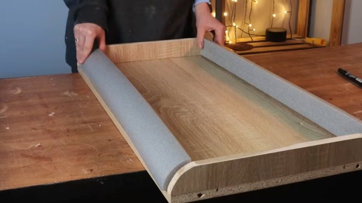 Разберите комод на части. Выдвижные ящики не пригодятся. Чтобы сгладить углы и изменить форму комода сверху и снизу, возьмите профиль из вспененного полиэтилена. Выпилите боковые части, склейте. Внутрь вклейте поролон подходящей толщины.Лайфхак!