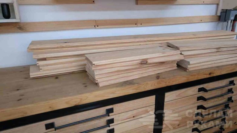 На следующем этапе отпиливаем по размеру деревянную вагонку (доски, которые имеют шип и паз для стыковки друг с другом).