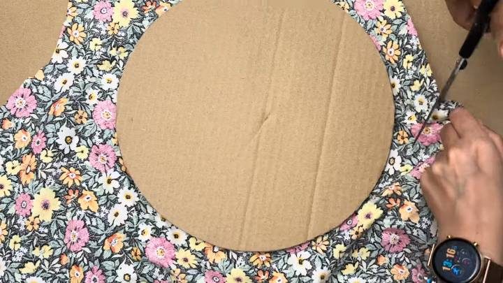 Возьмите толстый гофрокартон. С помощью плоской тарелки перенесите круг, вырежьте 2 одинаковые заготовки. К обеим приклейте ткань с одной стороны. Ткань подойдёт абсолютно любая.