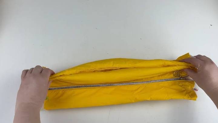 Оставшуюся часть куртки — верхнюю, с рукавами — сложите и поместите внутрь. Застегните молнию. Получилась оригинальная декоративная подушка! Для неё даже не нужно покупать наполнитель. Самый простой и быстрый вариант!
