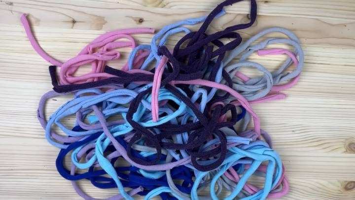 Получится трикотажная полоса из носка! Вытяните её руками, чтобы она сузилась и закрутилась. Полосы можно оставить как есть или сшить между собой, если в этом есть потребность.