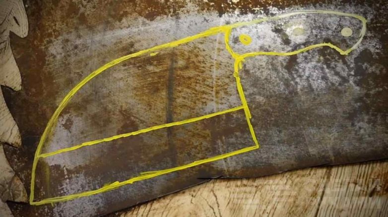 Затем автор рисует на заготовке эскиз будущего ножа. После этого необходимо будет вырезать его по контуру болгаркой.