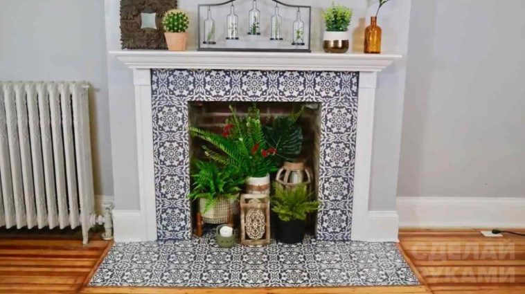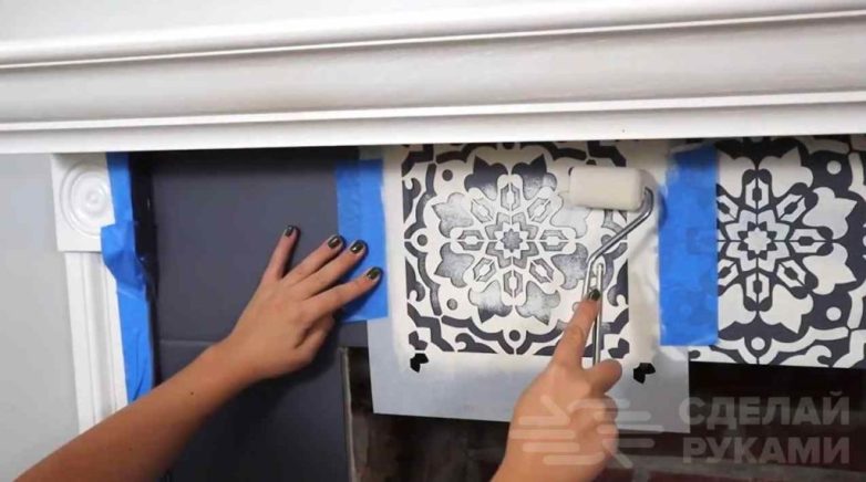 В данном случае автор наносит трафаретный узор на плитку, которой облицован камин и пол рядом с ним. Но в целом эту технологию можно применить абсолютно к любой плитке.