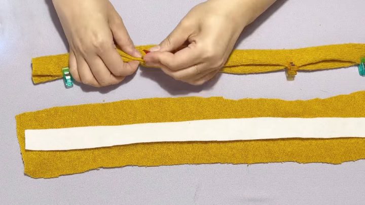 Из той же ткани вырежьте 2 детали 50*2,5 см. Вставьте флизелин/дублерин, прошейте. Получились 2 ручки!