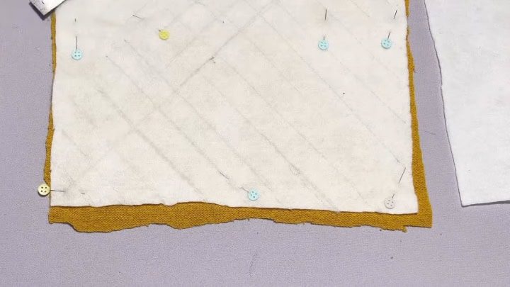 Разрежьте свитер на 2 квадрата со сторонами 36 см. Такие же заготовки сделайте из флизелина или дублерина. На расстоянии 1 см прочертите крест-накрест. Проложите строчку по линиям.