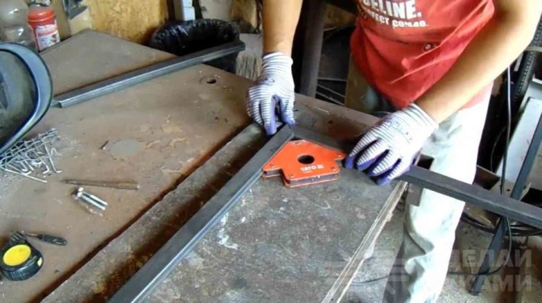 Отрезаем от профильной трубы заготовки нужного размера, и свариваем их вместе.