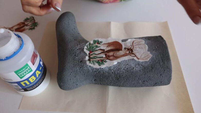 Когда сапоги полностью высохнут, покрасьте их краской выбранного цвета. После высыхания краски переходим к самому приятному этапу работы — оформлению сапожек. Для этого можно использовать технику декупаж или роспись. Для завершения работы покройте сапожки слоем акрилового лака.