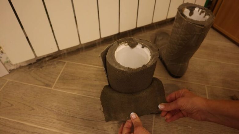 Поместите в каждый сапог пластиковый стаканчик от сметаны, наполненный песком. Благодаря стаканам цемент в сапогах поднимется до самого верха. Поместите груз на сапоги и ставьте изделие до затвердения раствора.
