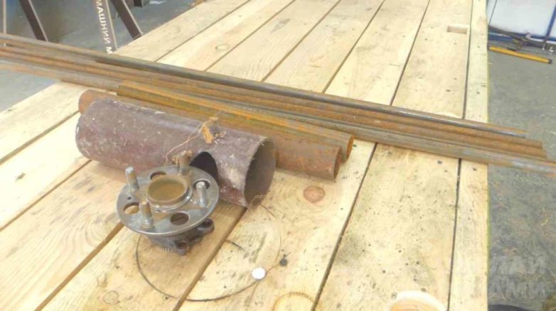 Для этого потребуются подручные материалы: обрезки труб, доски и фанера. Также надо будет раздобыть автомобильную ступицу (на металлоприемке или в гараже у соседа).