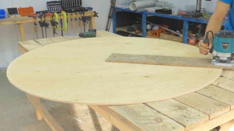 Первым делом делаем разметку на листе фанеры, а потом с помощью ручного фрезера вырезаем круг нужного диаметра. Края потом тоже надо обработать фрезой.