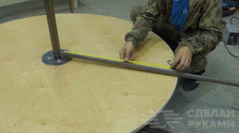 По центру нужно сделать отверстие под стойку, в качестве которой выступает стальная круглая труба.