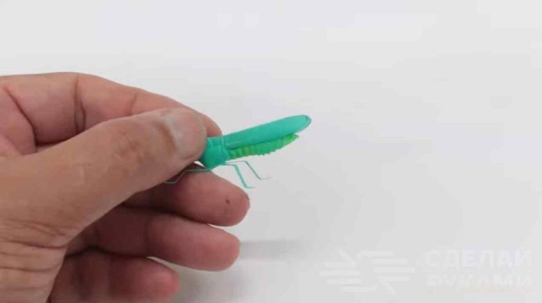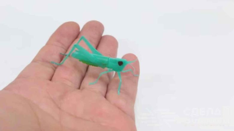 Потом останется только сделать и приклеить к телу задние лапы. Маркером рисуем глаза. Получается очень даже реалистично — от настоящего кузнечика и не отличишь.