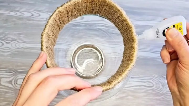 Немного преобразите вазу-шар. На дно приклейте бобину от скотча, обёрнутую джутом. Сверху нарастите горлышко с помощью картона+джута.