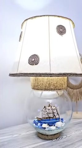 Декорируйте абажур, ориентируясь на собственный вкус (пряжей, верёвкой, бусинами и т. п.). Установите на вазу-шар. Вклейте в абажур 2 рейки, совместите крест-накрест.