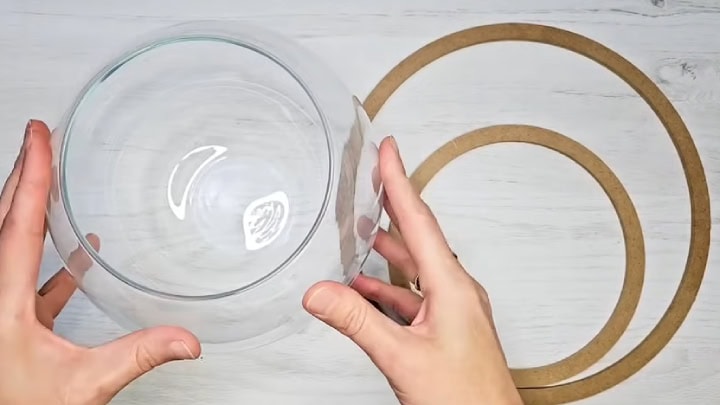 Возьмите 2 деревянных кольца разного диаметра. Склейте их между собой с помощью деревянных шпажек.
