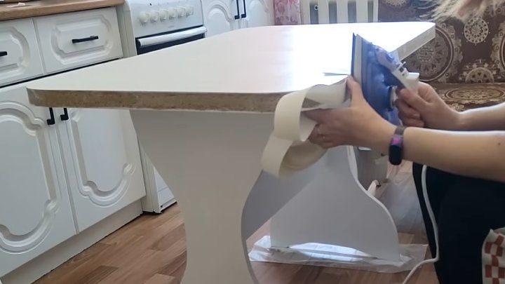 Для начала со старого стола нужно снять кромку, если она пришла в негодность. Для того чтобы это было легче сделать, проутюжьте её через бумагу. Клей размягчится, и удалить её будет легко! Подденьте кромку ножом и снимите.