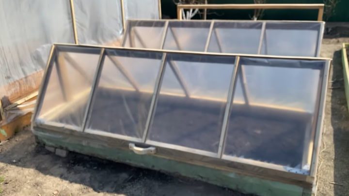 Под наклоном прикрепите доски, чтобы собрать полноценную крышу парника. Обтяните плёнкой.