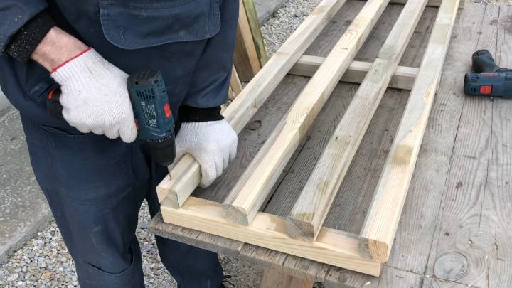Соберите основание будущего короба. Положите несколько длинных заготовок и саморезами закрепите на них деревянные бруски поперек.