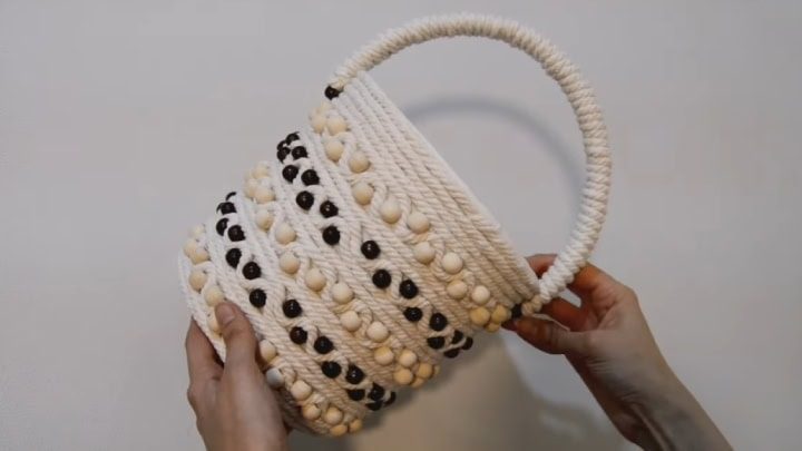 Возьмите канат или толстую пряжу. Закройте дно снаружи. Затем, перейдя на внешнюю сторону стенок, начните оборачивать ведёрко и приклеивать. Добавляйте бусины, как показано на фото ниже: