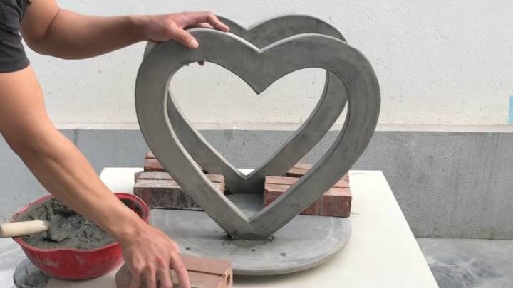 Уберите пенопласт. Соедините заготовки между собой на тот же цементно-песчаный раствор. Снизу и сверху — круги, между ними — 2 сердца.