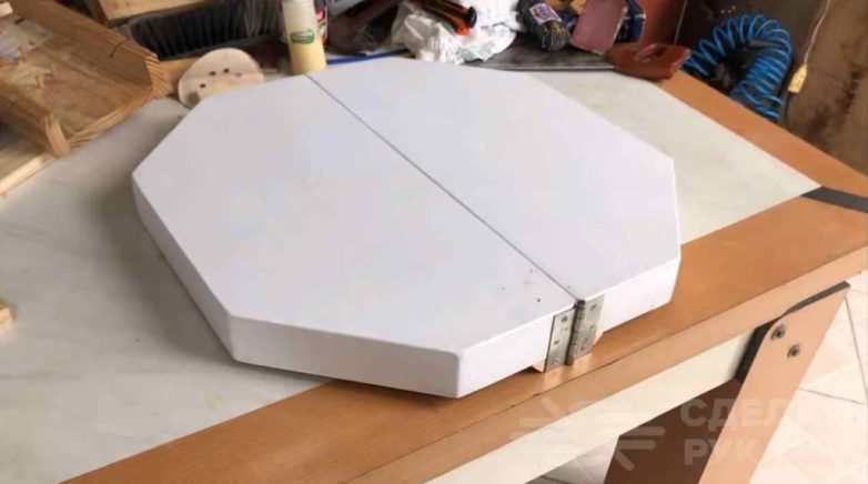 Первым делом из досок и деревянных брусков надо изготовить две половинки столешницы. Красим их и соединяем при помощи петли таким образом, чтобы две половинки раскрывались в разные стороны.