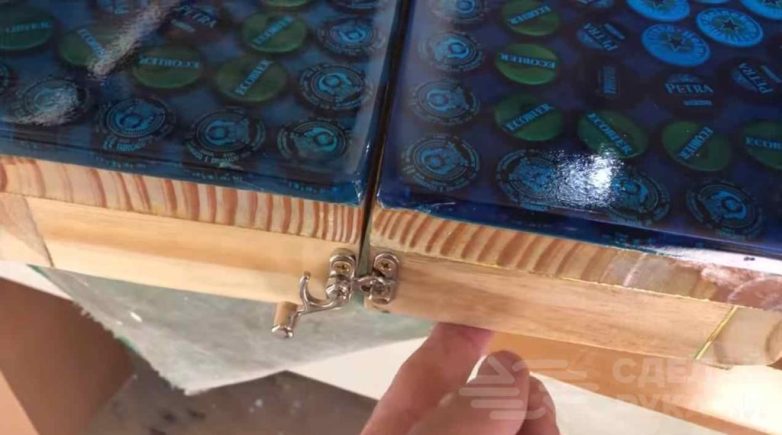 Затем останется лишь установить замочек, который будет фиксировать половинки столешницы. Покрываем верхний слой эпоксидки лаком.