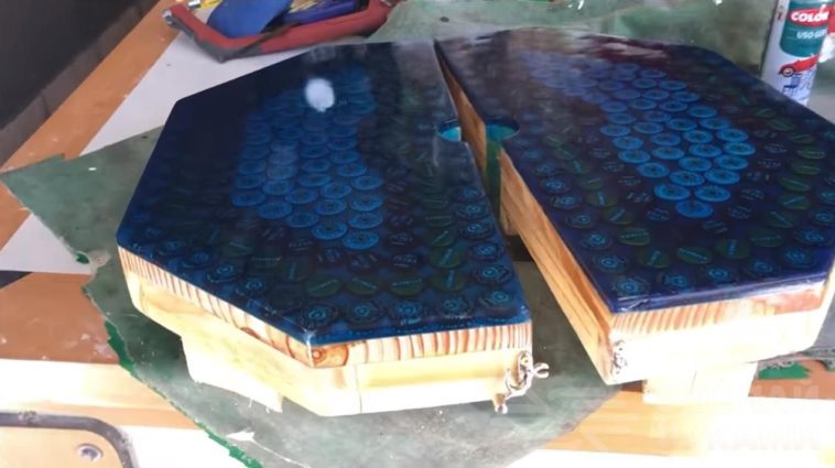 Для изготовления столешницы потребуются доски, деревянные бруски, крышки от бутылок (металлические), эпоксидная смола.