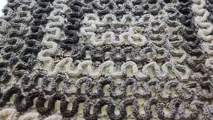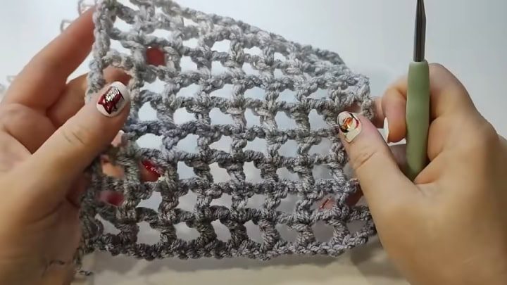 Дойдите до конца ряда, поднимитесь на 3 ВП. Сделайте дальше, как в прошлом ряду, ещё 2 ВП + накид + вставьте крючок в вершинку предыдущего ряда и свяжите ССН. Далее в таком же духе вяжите всё полотно. Получится такое «решето».