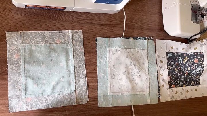 Затем отрежьте лишнее и остаток полосы пришейте к другой стороне. Таким образом, заполните все 4 стороны квадрата. Обязательно утюжьте блоки.