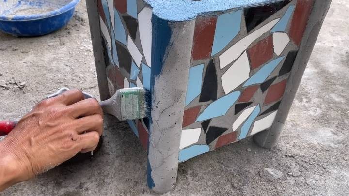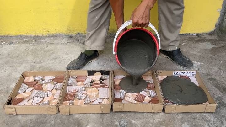 Разложите 4 плотные картонные коробки одинакового размера. Размер опционален и зависит только от вашего выбора. В каждую коробку одним слоем разложите битую плитку. Подойдут все, даже самые маленькие кусочки! Соедините песок с цементом в соотношении 2:1. Можно также взять готовую ЦПС. Разведите водой до необходимой густоты. Залейте формы из картона. Чтобы укрепить готовую конструкцию, можно положить в раствор металлическую сетку.
