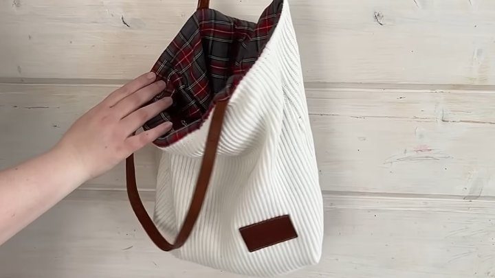 Возьмите ткань для подкладки. Сшейте из неё такую же деталь, как из свитера. По желанию добавьте карман. Совместите детали, вставьте ручки, прошейте по краю, оставляя небольшое отверстие для выворачивания.