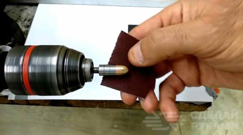 На следующем этапе фиксируем винт с гайками в патроне электродрели, предварительно зажав ее в тисках. Включаем дрель, и начинаем обрабатывать заготовку напильником по металлу.