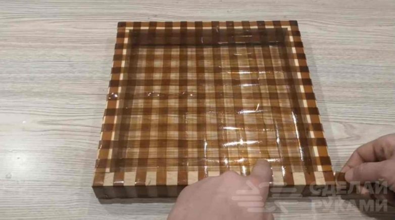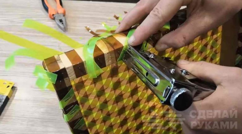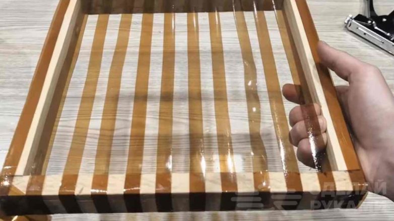 Первым делом потребуется собрать деревянную рамку. Потом с помощью степлера автор крепит коричневые полосы: сначала в продольном направлении, потом — в поперечном.